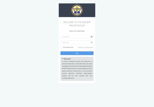 Image. WELCOME TO THE NEW BFP ONLINE PAYSLIP. SIGN IN TO CONTINUE. Remember Me. Forgot your password? Login.