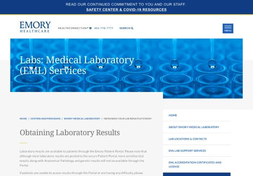 How to obtain your lab results as a patient at Emory Healthcare. ... Laboratory results are available to patients through the Emory Patient Portal. Please note that ...