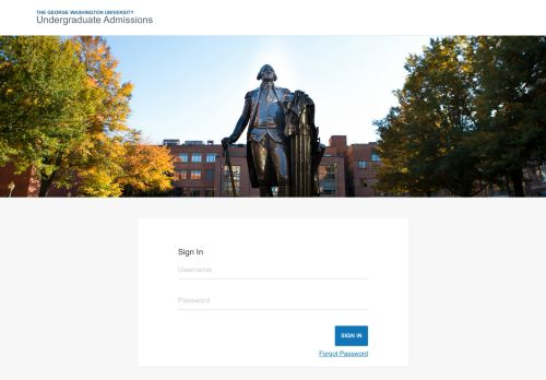 Toggle navigation. The George Washington University Undergraduate Admissions. Sign Up · Log In. Sign In. Username Password. Sign In. Forgot Password.