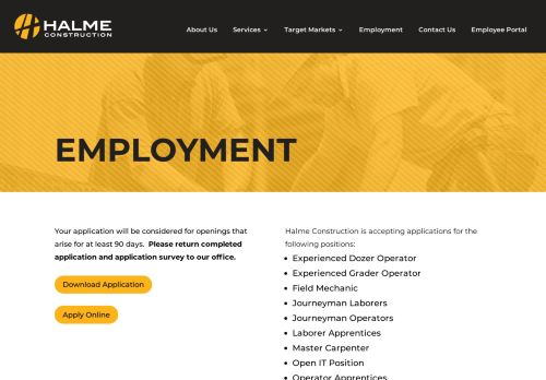EMPLOYMENT · Experienced Dozer Operator · Experienced Grader Operator · Field Mechanic · Journeyman Laborers · Journeyman Operators · Laborer Apprentices ...