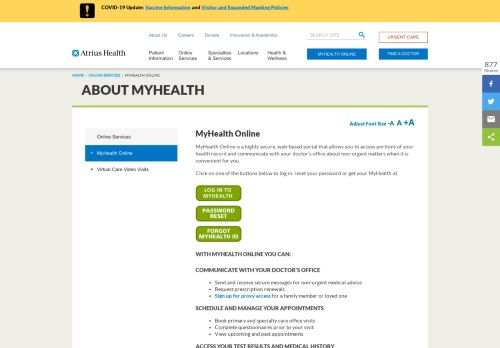 MyHealth Online is a highly secure, web-based portal that allows you to access portions of your health record and communicate with your doctor's office about ...