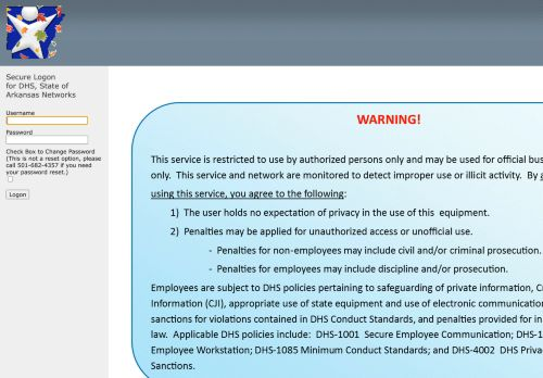 for DHS, State of Arkansas Networks. Username. Password. Check Box to Change Password (This is not a reset option, please call 501-682-4357 if you need ...
