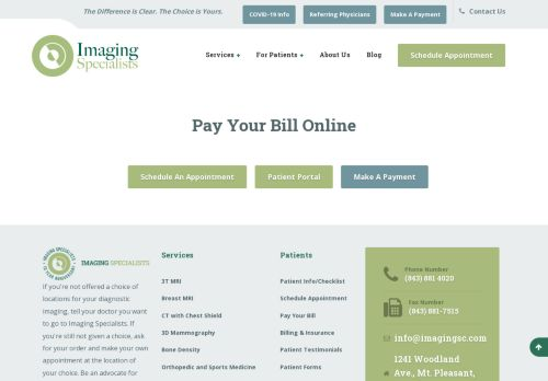 Pay Your Bill Online. Schedule An AppointmentPatient PortalMake A Payment. Imaging Specialists of Charleston. If you're not offered a choice of locations ...