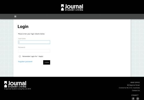 Please enter your login details below. Username: Password: Remember Login for 1 day(s). Login. Forgotten password. © Journal Student Living Pty Ltd 2018.