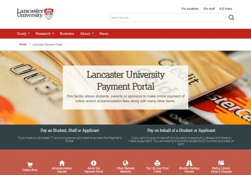 Lancaster University. Payment Portal. This facility allows students, parents or sponsors to make online payment of tuition and/or accommodation fees along with ...