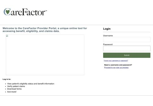 Welcome to the CareFactor Provider Portal, a unique online tool for accessing benefit, eligibility, and claims data. Log in to: View patient's eligibility status and ...