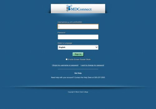 myMDC | Miami Dade College. Error ... Get Help. Need help with your account? Contact the Help Desk at 305-237-2505. Copyright © Miami Dade College.