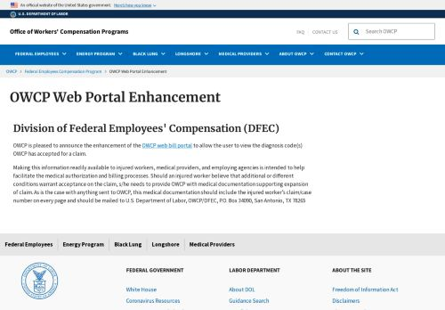 OWCP is pleased to announce the enhancement of the OWCP web bill portal to ... Department of Labor, OWCP/DFEC, P.O. Box 34090, San Antonio, TX 78265.