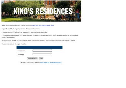 Before you proceed, please make sure you watch our How to book your accommodation video. Login with your KCL ID as your Username. Please do not use the K.