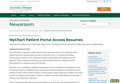 PLEASE NOTE: As of 11/9/19 this Portal is only up to date with hospital information like ... activate your new UVM Health Network MyChart account at MyChart.