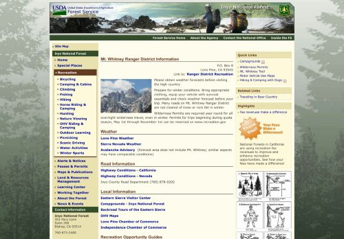 Lone Pine, CA 93545 ... Many roads on Mt. Whitney Ranger District are not cleared of snow or rock fall in ... Hiking Whitney Portal National Recreation Trail ...